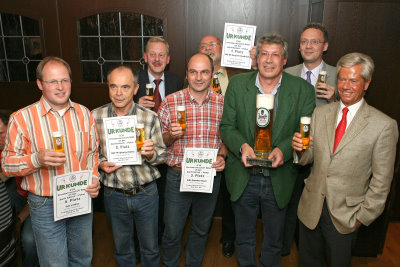 Der 2. Vorsitzende Detlef Baldauf, Freizeit- und Breitensportobmann Siegfried Fabritius vom Fußballkreis Berg, Brauereichef Dr. Axel Haas und Oliver Pack, Werbeleiter der Erzquell Brauerei überreichten hier den Zunft Kölsch - Pokal, eine Urkunde, den € 1.500,00 Siegerscheck sowie einen Biergutschein über 100 Liter Zunft Kölsch für die Siegesfeier an die Ü 32 ‑ Mannschaft des SSG 09 Bergisch Gladbach, die in 2006 zum ersten Mal an dem Turnier teilnahm.