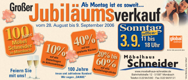 Zur großen Jubiläumsfeier locken allen Kunden vom 28. August bis zum 9. September 2006 lukrative Schnäppchen mit bis zu 60 Prozent Preisnachlass. Das Geschäft ist auch am Sonntag, 3. September, von 11 Uhr bis 18 Uhr geöffnet. (oh-25.08.2006 09:15)