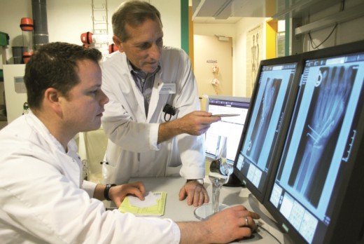 | Die Handchirurgen Dr. Thorsten Franz (l.) und Dr. Walter Schäfer (r.) bei der Begutachtung einer Aufnahme einer verletzten Hand. (Foto: Klinikum Oberberg) |