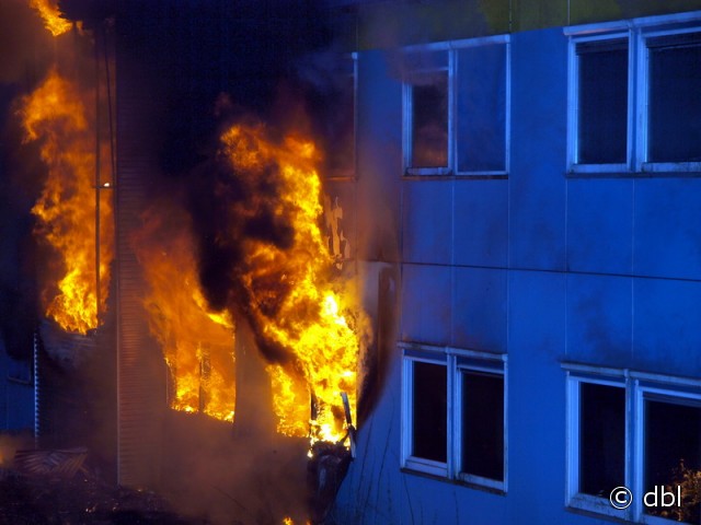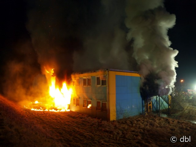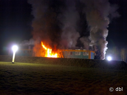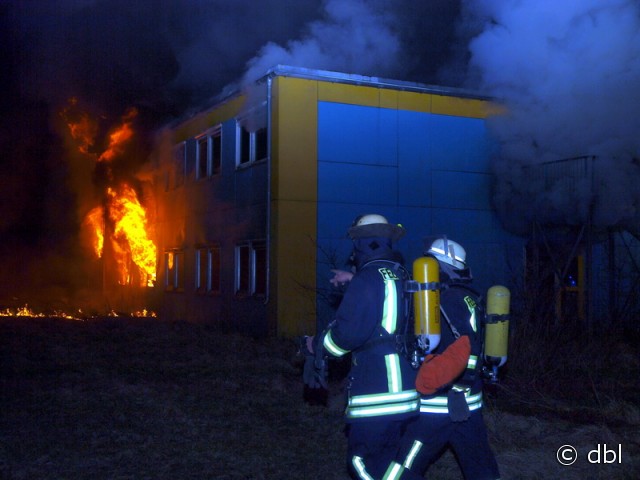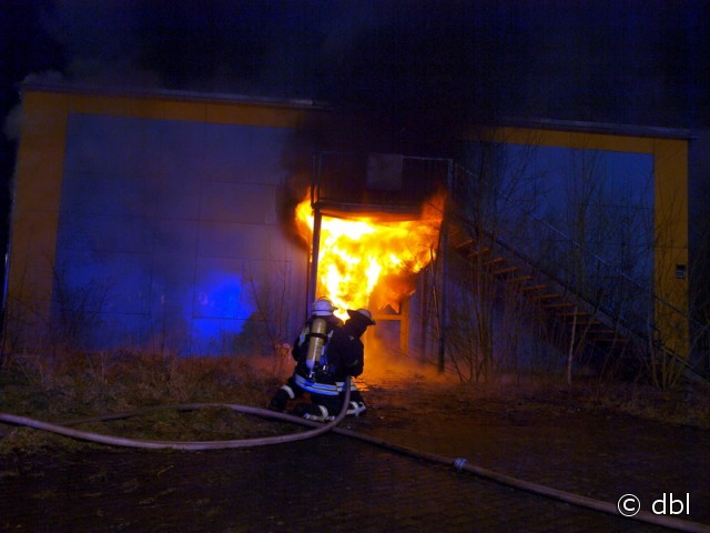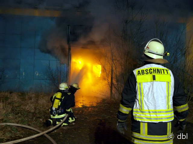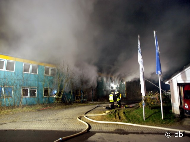 Bei Eintreffen der ersten Kräfte der Feuerwehr Engelskirchen, schlugen bereits meterhohe Flammen aus dem linken Teil des Gebäudes. Kurz darauf stand die Halle in Vollbrand. Die Löschmaßnahmen, die die Feuerwehr unter Einsatzleiter Thomas Krimmel von allen Seiten vornahm, wurden durch Schaulustige vorübergehend stark behindert. Durch die bis zum Einsatzort rücksichtslos geparkten Privatfahrzeuge konnten Einsatzfahrzeuge teilweise nicht optimal in Stellung gebracht werden.