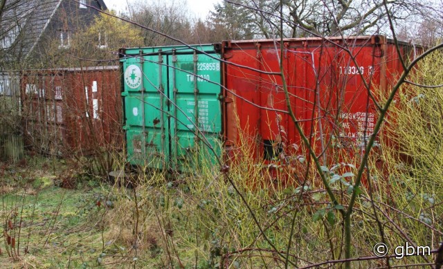 | Vier große Überseecontainer wurden in einer spektakulären Aktion 2011 hinter das neu erworbene Haus von Anett c. Kaiser gestellt. |