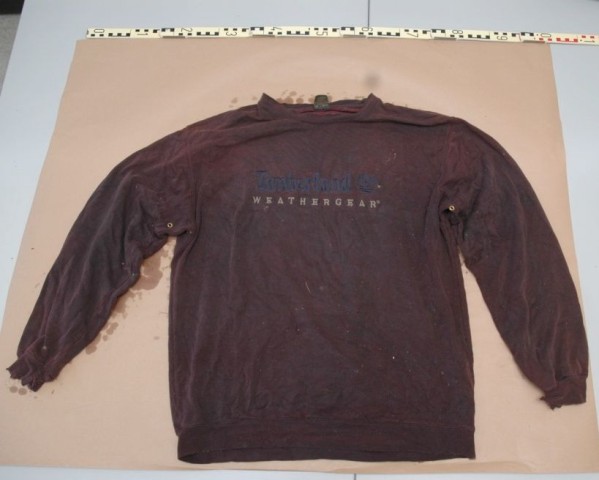 Und ein mittelbraunes Sweat-Shirt der Marke Timberland, Größe L, mit den Schriftzügen "Timberland", darunter "Weathergear" auf der Brust und auffälligen Beschädigungen an beiden Ärmeln und dem linken Ärmelband. Diese könnten durch Hundebisse verursacht worden sein.