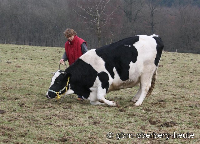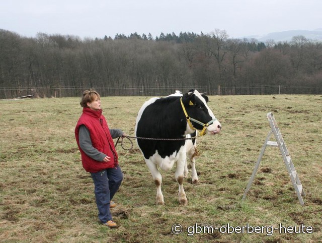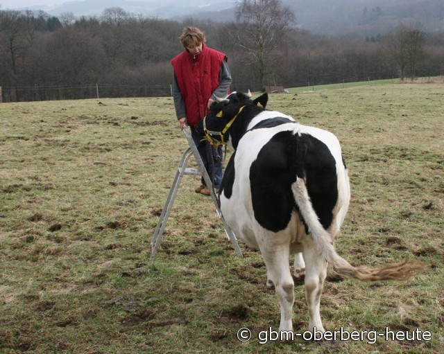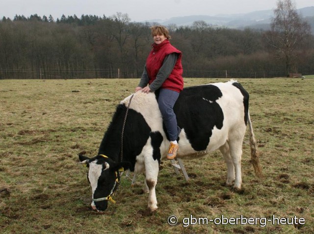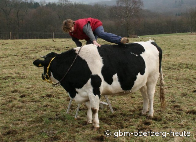 ..natürlich nicht. Das ist eine Aufsteigehilfe für Ines Wackwitz. Sie übt sich in Sachen Kuh-Reiten